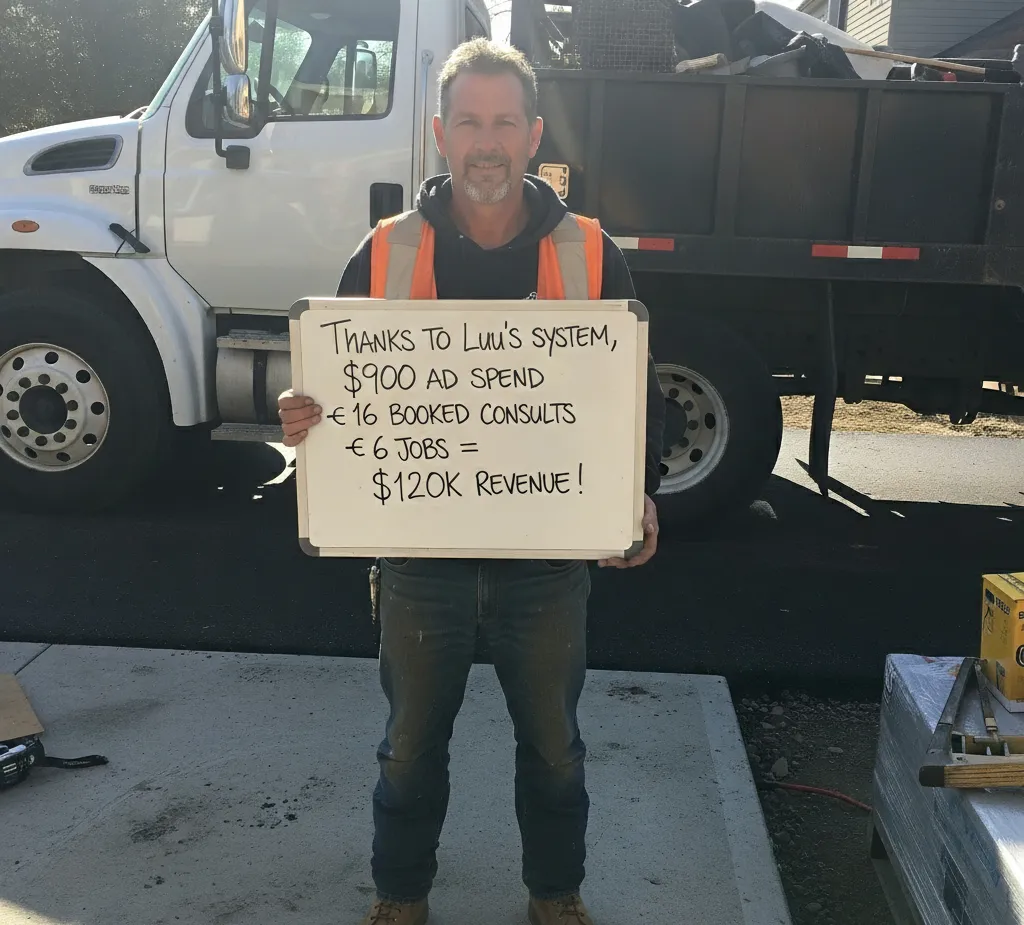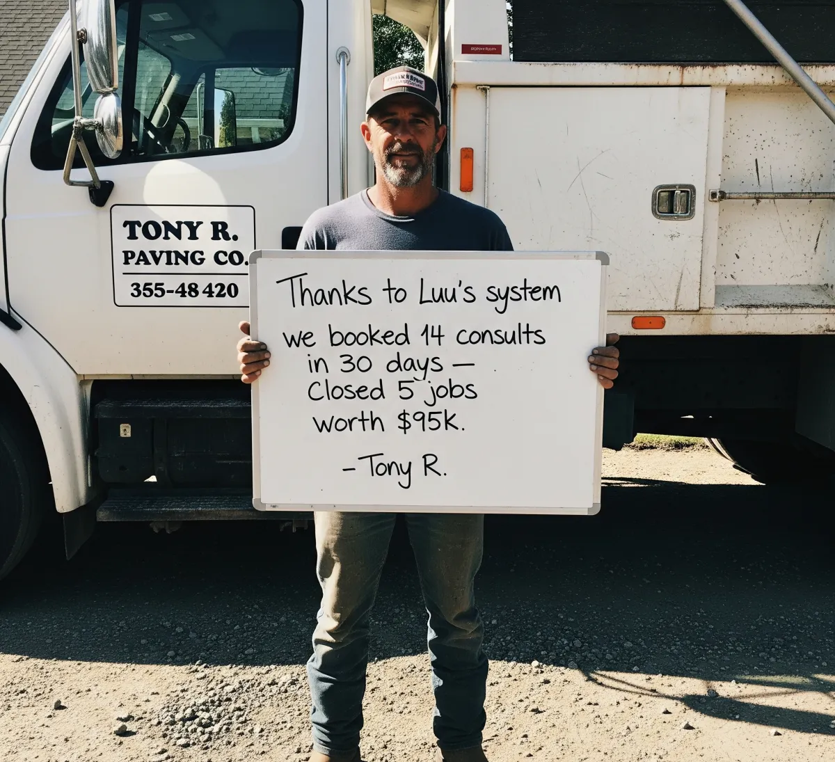 "We were weeks from closing. I couldn’t pay rent, and my crew was ready to walk, Every night i would stay up looking at the celling, thinking of a way out. Within 27 days of using the system, we booked 6 driveway jobs. It gave us the lifeline we needed." - Tony R., Owner, Tony R Paving CO